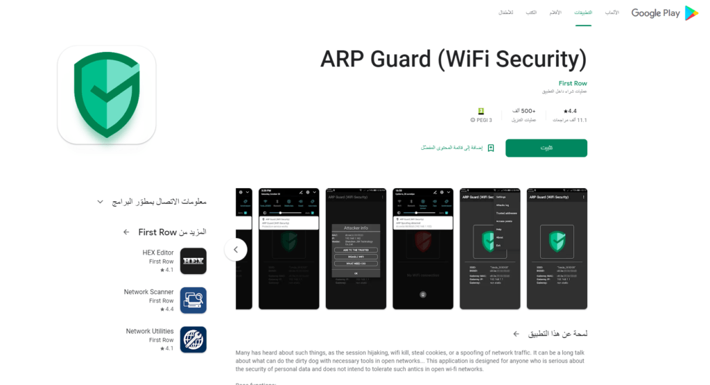 تطبيق ARP Guard (WiFi Security) يقوم بحماية شبكة الواي فاي ومنع اختراقها أو سرقة ملفات تعريف الارتباط الخاصة بالشبكة كما يتميز التطبيق بتنبيه في حال وجود أي متطفلين أو اختراق للواي فاي كما يقوم بإيقاف تشغيل شبكة الواي فاي عند اكتشاف أي قرصنة من جهاز غير معروف.