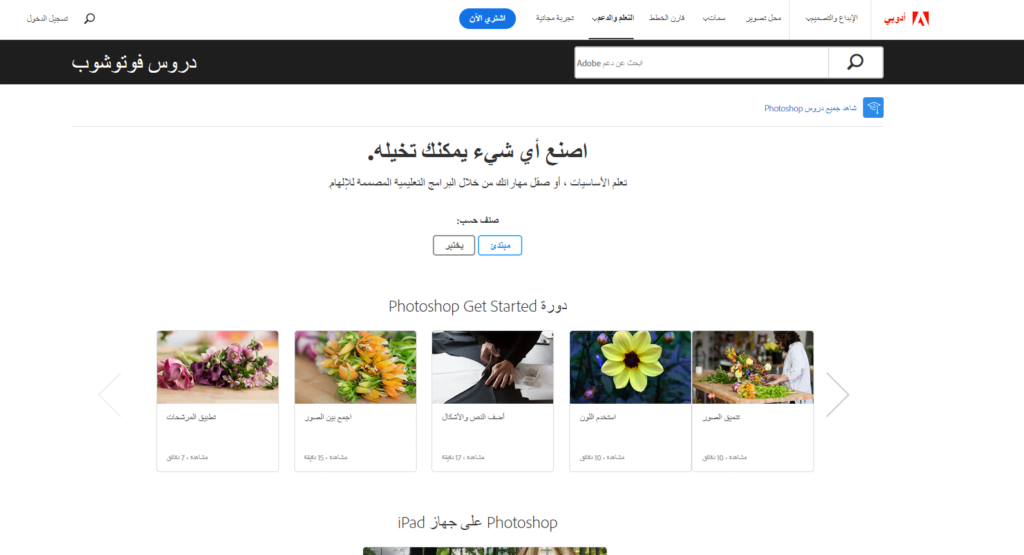 موقع Adobe أفضل مواقع تعلم التصميم ومن أشهر منصات تعليم الفوتوشوب للمبتدئين وحتى الخبراء في مجال التصميم والفوتوشوب حيث يتيح الموقع الكثير من الدورات التعليمية والدروس التي تعلمكم الفوتوشوب من الصفر وحتى الاحتراف بكل سهولة بالإضافة إلى مقاطع فيديو تتضمن شرحات تفصيلية لكيفية تعلم الفوتوشوب.