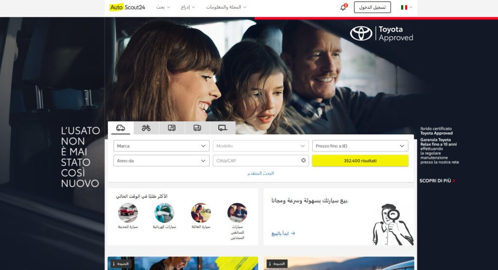 يعتبر موقع أوتو سكوت 24 AutoScout24 من أشهر مواقع بيع السيارات المستعملة في إيطاليا ويوفر لكم الموقع أفضل عروض السيارات المستعملة والاتصال المباشر مع البائع ويقدم لكم ميزة البحث السريع والبسيط من خلال تحديد العلامة التجارية المفضلة والطراز ونوع الوقود واللون والداخلية والسعر وغير ذلك الكثير.