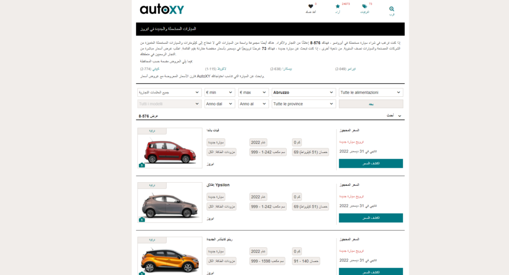 موقع أوتو إكس إي Autoxy يقدم لكم الكثير من العروض الرائعة على السيارات المستعملة في كافة المدن الإيطالية ولجميع العلامات التجارية للسيارات العالمية كما يتيح لكم الحصول على عرض أسعار مباشرة من التجار الرسميين في منطقتكم ولسهولة البحث يمكنكم تحديد نوع السيارة التي ترغبون بها والطراز وسنة الصنع والسعر المناسب لكم .
