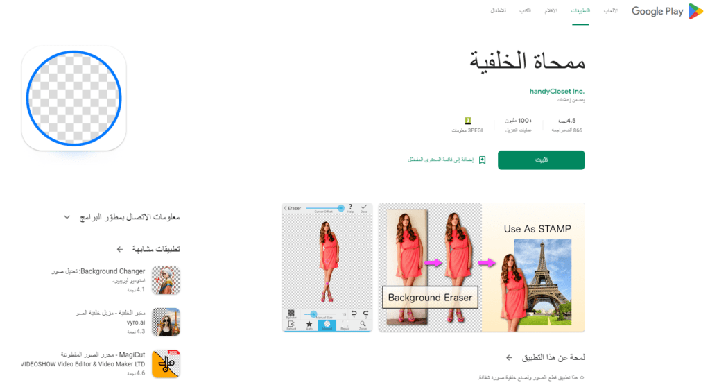 تطبيق ممحاة الخلفية أشهر برنامج إزالة الخلفية من الصورة للاندرويد يقوم بمحو خلفية أي صورة ترغب بالتعديل عليها كما أنه يتيح لكم صنع ملصقات من خلال البرنامج ويوفر العديد من الخيارات في محو خلفية الصور بدقة عالية وجعل الصور المركبة جيدة.