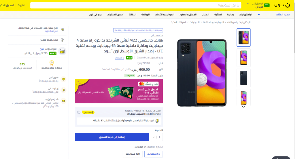 سعر هاتف سامسونج إم 22 Samsung Galaxy M 22 في السعودية يبلغ حوالي 650 ريال سعودي أي ما يعادل 174 دولار أمريكي وهذا السعر تقريبي بحسب السعة التخزينية واللون والمتجر.