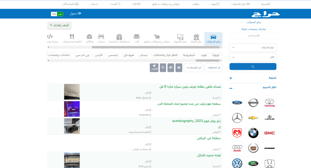 موقع حراج من أشهر مواقع بيع السيارات في الوطن العربي حيث تجدون في الموقع العديد من سيارات تويوتا وفورد وشيفروليه ونيسان وهونداي ولكزس وكاديلاك وكافة أنواع وموديلات السيارات كما تجدون مجموعة الشاحنات الصغيرة والكبيرة بالإضافة إلى قطع غيار السيارات بكافة أنواعها.