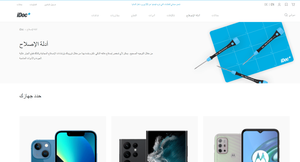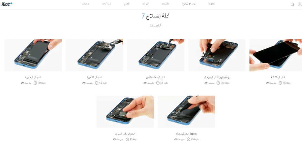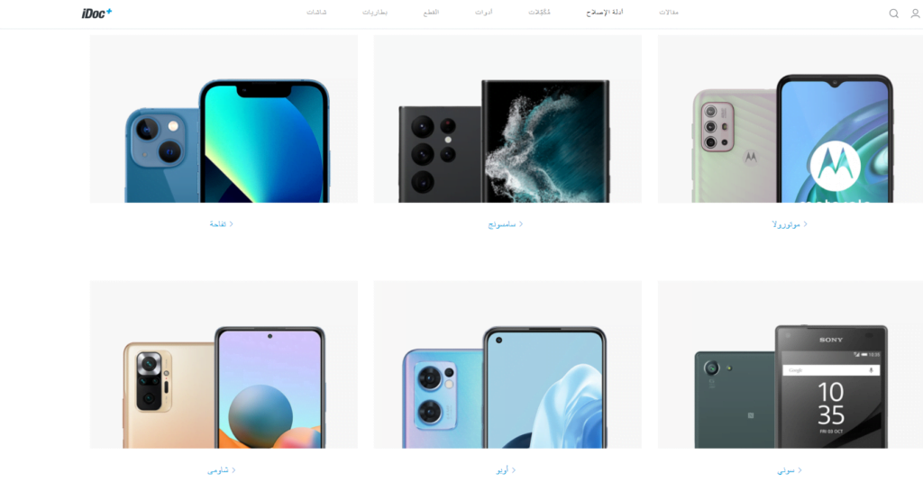 ومن خلال أيقونة أدلة الإصلاح الموجودة على واجهة موقع idoc يمكنكم تعلم صيانة وإصلاح الهواتف المحمولة بكافة أنواعها من أجهزة أيفون وسامسونج وموتوريلا وشاومي وأوبو وسوني وهواوي ومايكروسوفت وإل جي وغيرها.