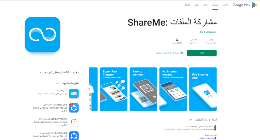 تطبيق ShareMe افضل برنامج نقل الملفات للاندرويد وهو تطبيق آمن وسهل الاستخدام ويدعم مشاركة الملفات لاسلكياً ويمكنكم مشاركة الصور الخاصة ومقاطع الفيديو والموسيقى والتطبيقات والملفات بسرعة بين أجهزة الاندرويد وبدون الاتصال بالشبكة بالإضافة الى العديد من المميزات الرائعة.
