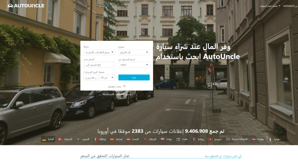 موقع autouncle هو موقع ألماني متخصص ببيع السيارات المستعملة ذات الجودة العالية في جميع انحاء أوروبا ويضم الموقع عدد كبير جداً من عروض السيارات المستعملة وبأسعار منافسة ورخيصة وتجدون في الموقع كافة أنواع السيارات العالمية مثل مرسيدس ورينو وسيتروين وبي إم دبليو وغيرها من أنواع السيارات العالمية.