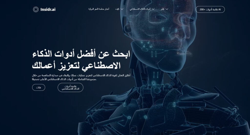 موقع إنسايدر أي insidr ai يضم أكثر من 200 من أفضل أدوات الذكاء الاصطناعي الاحترافية والمجانية بالإضافة إلى مراجعات ومقارنات لأفضل الأدوات في كل فئة، ويقدم موقع Insidr.ai أيضا مدونة ورسالة إخبارية مع رؤى حول أحدث الاتجاهات والتطورات الذكاء الاصطناعي.