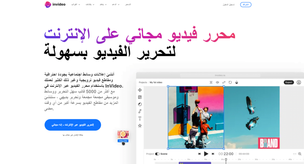 موقع invideo هو محرر فيديو مجاني على الانترنت وإنشاء إعلانات وسائط اجتماعية بجودة عالية ومقاطع فيديو ترويجية بالإضافة لوجود أكثر من 5000 قالب وتحرير الصوت بدقة عالية وتغيير سرعة الفيديو وتصحيح الألوان ولا يضع الموقع علامة مائية بعد الانتهاء من تحرير الفيديو والعديد من الميزات الرائعة والاحترافية.