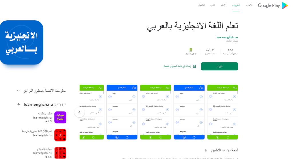 تطبيق تعلم اللغة الانجليزية بالعربي هو افضل تطبيقات تعلم اللغة الإنكليزية في الوطن العربي لإنه يتيح تعلم اللغة الإنكليزية للمبتدئين بكل سهولة من الصفر إلى مرحلة الإتقان والطلاقة بواسطة تعلم الكثير من المفردات وكيفية نطقها بالإضافة إلى تعلم القواعد اللغوية الانكليزية.