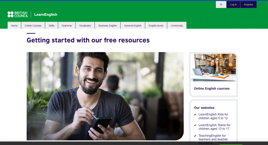 موقع British council learn English من افضل مواقع تعلم اللغة الإنجليزية حيث يتيح لكم الموقع تحسين لغتكم الانجليزية بواسطة خبراء متخصصين بتعليم اللغة الإنكليزية كما يوفر الموقع الكثير من الموارد التعليمية والأنشطة التفاعلية واختبارات لتحديد المستوى.
