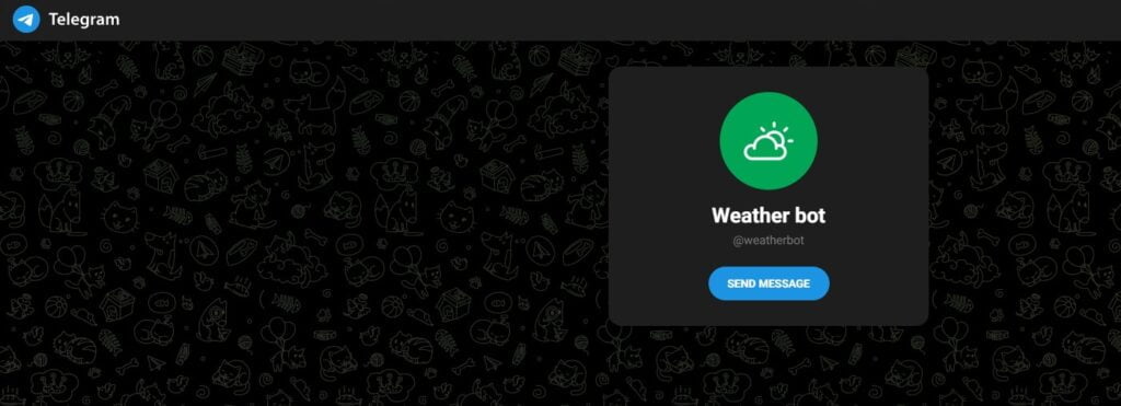 Weather Bot Telegram هو بوت تليجرام يمكنك استخدامه للحصول على معلومات الطقس الحالية والمستقبلية لمدينة أو موقع معين، ويمكنك استخدام البوت للعثور على درجة الحرارة والرطوبة وسرعة الرياح واتجاهها وحالة الطقس الحالية والمتوقعة، ويمكنك أيضًا الحصول على تقارير الطقس التفصيلية لكل ساعة أو يوم أو أسبوع.