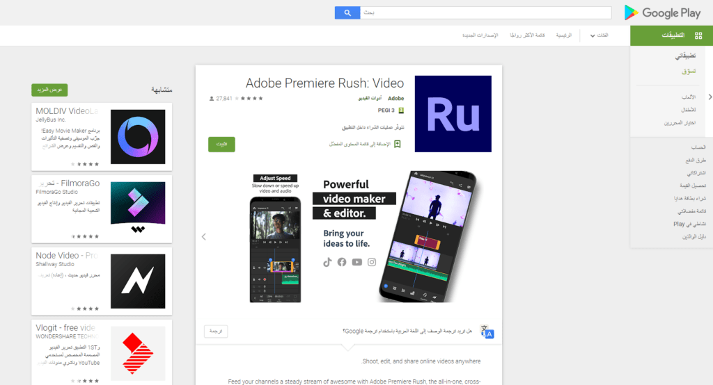 تطبيق أدوب بريمر Adobe Premiere Rush أشهر برنامج تحرير فيديو وبدون علامة مائية وهو من أفضل تطبيقات تحرير الفيديو للاندرويد 2023 حيث يسمح لكم التطبيق بالتعديل على مقاطع الفيديو الخاص بكم كيف ما تشائون.