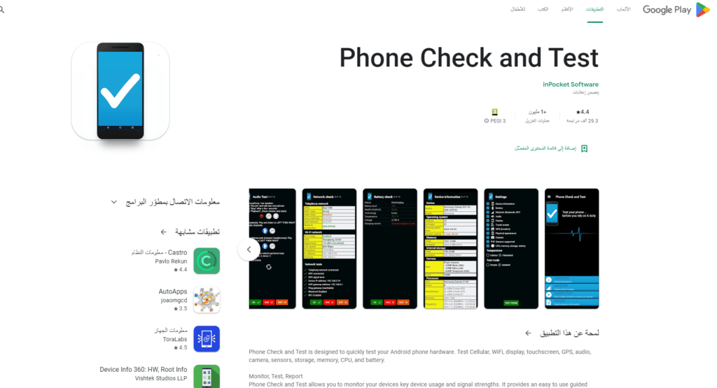 تطبيق فون تشيك Phone Check and Test يساعدكم في فحص كل ما يخص الهاتف المحمول وتشمل عمليات الاختبار الصوت والكاميرا و المستشعرات والتخزين والذاكرة وفحص وحدة المعالجة المركزية والبطارية.