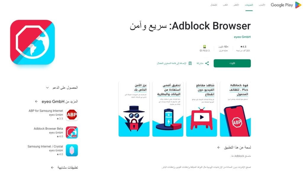 - تنزيل وتثبيت Adblock Browser: افتح متجر Google Play وابحث عن “Adblock Browser“، ثم، انقر فوق “تثبيت” لتثبيت التطبيق على جهازك.