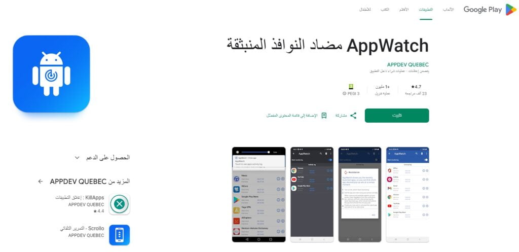 تطبيق AppWatch هو تطبيق مجاني لنظامي التشغيل Android ويساعدك في العثور على التطبيق الذي يعرض الإعلانات المنبثقة، يعمل التطبيق عن طريق مراقبة نشاط التطبيقات على هاتفك الذكي عندما يكتشف التطبيق إعلان منبثق، فإنه يسجل التطبيق الذي كان نشطًا في ذلك الوقت.