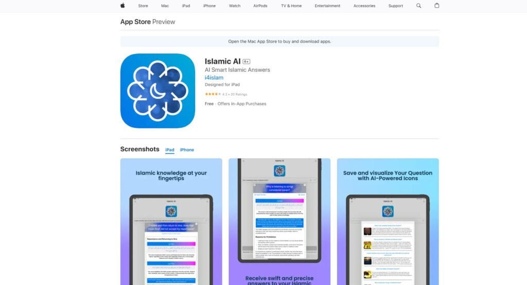 تطبيق Islamic AI أفضل تطبيق إسلامي بالذكاء الاصطناعي متوفر لأجهزة الايفون ويمكنك تنزيل تطبيق Islamic AI مجانا وبكل سهولة من خلال: