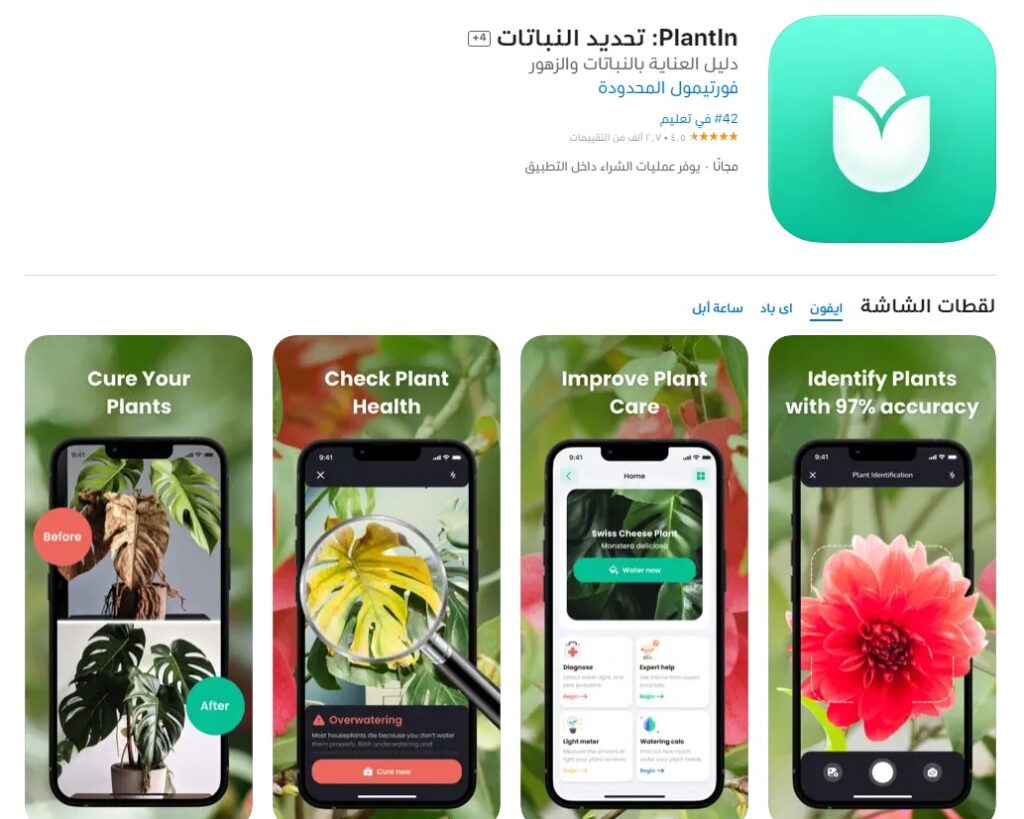 يُعد تطبيق PlantIn أفضل تطبيق لتحديد نوع النبات، ويقدم تعليمات ونصائح للعناية بالنباتات، ويتوفر التطبيق على كل من نظامي التشغيل Android و iOS، ويمكنكم تحميل التطبيق من خلال الروابط أدناه: