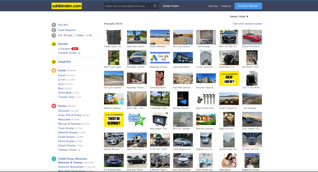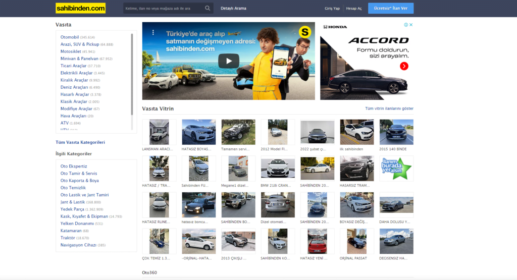 ويعتبر موقع وتطبيق sahibinden أكبر منصة إعلانات مبوبة في تركيا حيث يضم عشرات الفئات مثل السيارات والمركبات على الطرق الوعرة والدراجات النارية والشاحنات الصغيرة والمركبات البحرية.