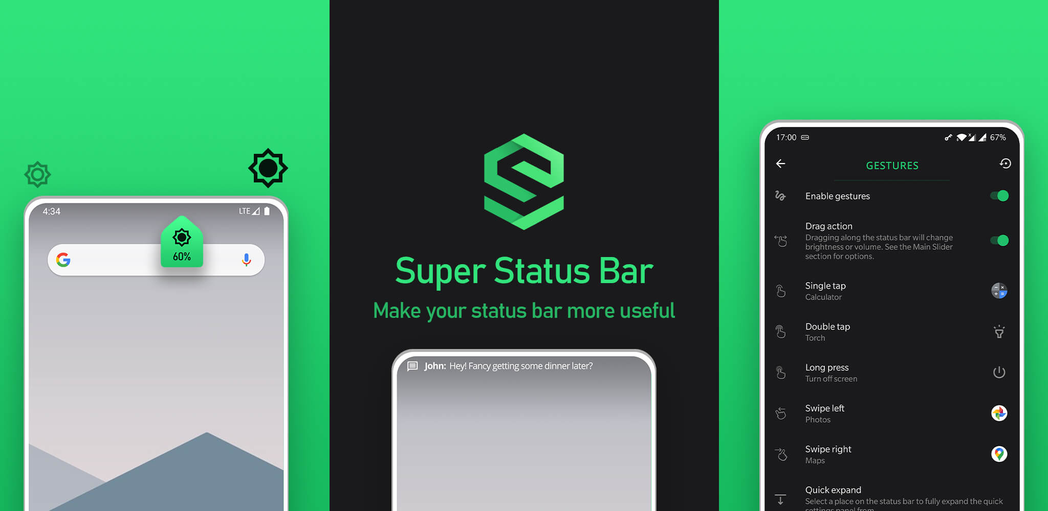 يعتبر تطبيق سوبر ستاتوس بار Super Status Bar أفضل تطبيق يساعدكم في تعديل شريط الحالة في الهاتف ويضيف التطبيق تعديلات مفيدة على شريط الحالة مثل الإيماءات ومعاينات الإشعارات والسطوع السريع والتحكم في مستوى الصوت.