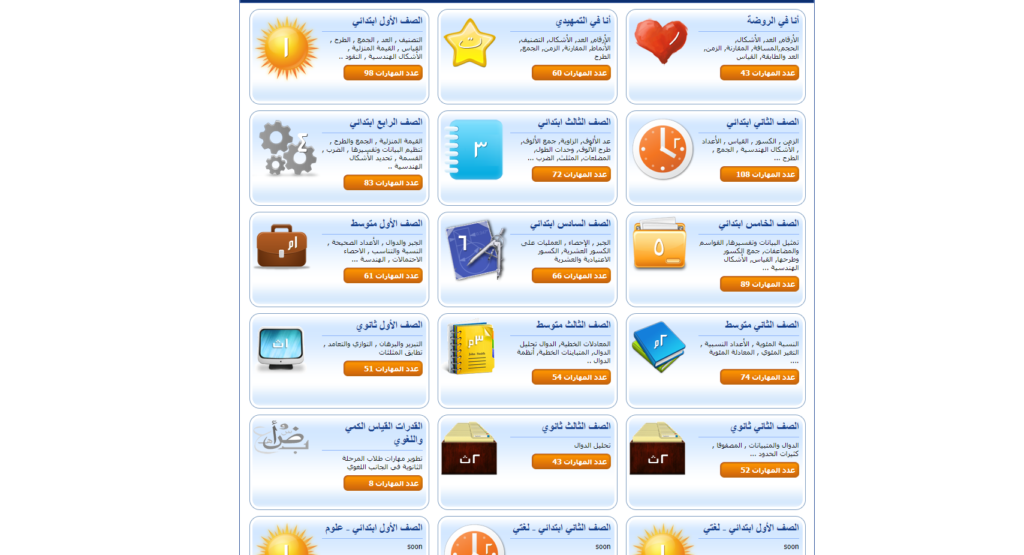 بعد الدخول على الصف المشترك فيه ستظهر لك المهارات كما هي مرتبة في الكتاب, يمكنك اختيار المهارة والبدء بالتعلم.