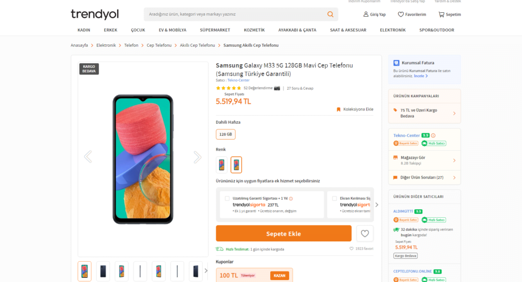 يبلغ سعر سامسونج ام 33 في متجر ترينديول 5520 ليرة تركية ويمكنكم شرائه ومعرفة كافت التفاصيل عبر الرابط أدناه: