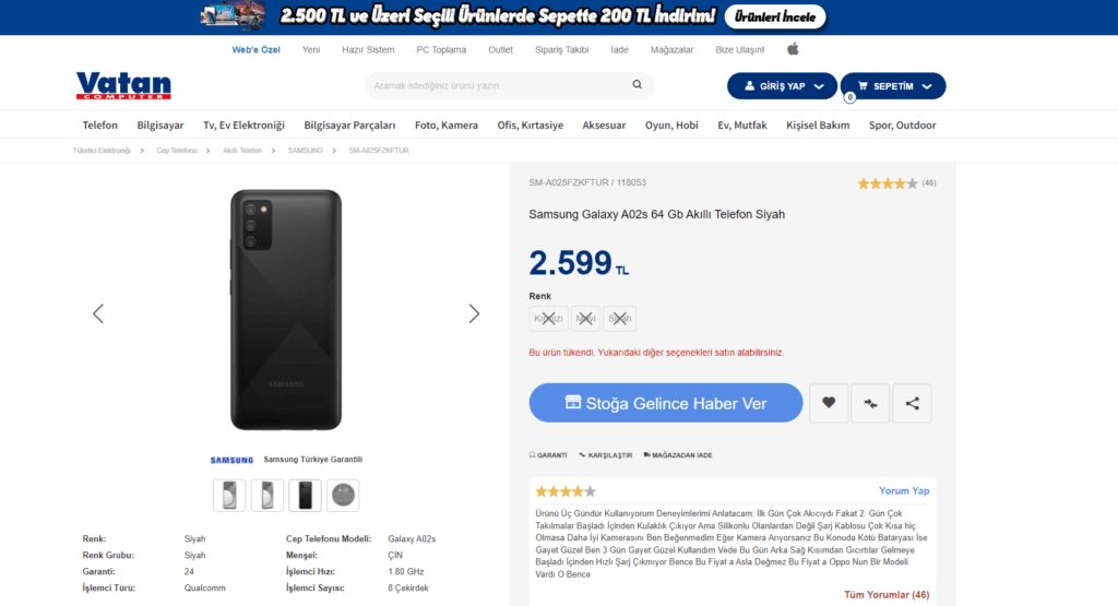 يبلغ سعر هاتف سامسونج جالاكسي إي 02 إس Samsung Galaxy A02s في متجر شركة وطن 2600 ليرة تركية https://www.vatanbilgisayar.com/samsung-galaxy-a02s-64-gb-akilli-telefon-siyah.html