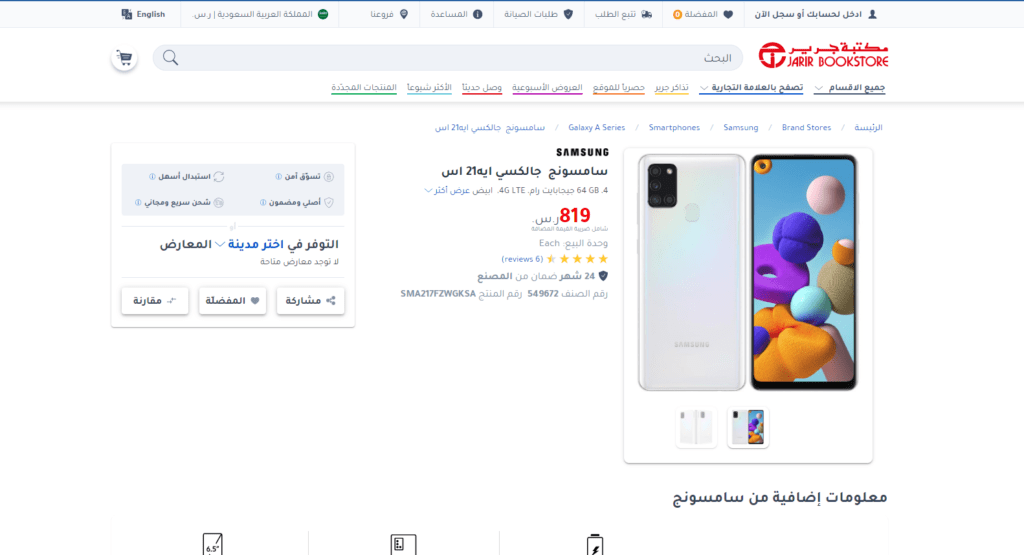 سعر هاتف سامسونج جالكسي اي 21 اس في متجر مكتبة جرير السعوددية