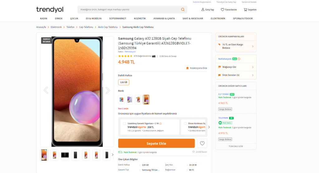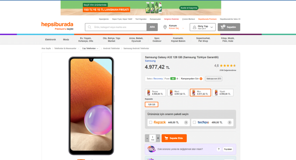 سعر سامسونج A32 في متجر هبسي بوردا يبلغ 4980 ليرة تركية بسعة تخزينية 128جيجابايت.
