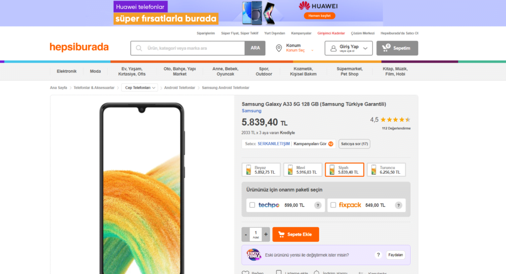 يبلغ سعر Galaxy A33 في متجر هبسي بوردا 5840 ليرة تركية.