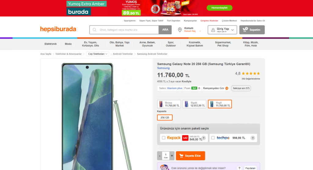 يبلغ سعر هاتف سامسونج جالكسي نوت 20 في متجر هبسي بوردا 11.760 ليرة تركية وبسعة تخزينية 256 جيجا بايت.
