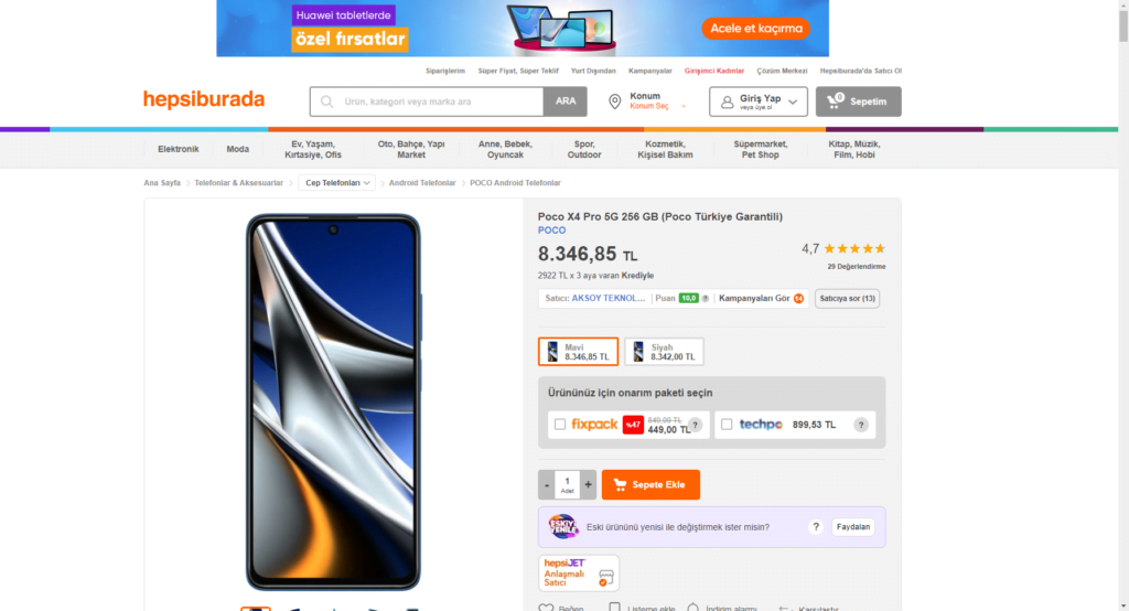 يبلغ سعر هاتف شاومي بوكو إكس4 برو Xiaomi Poco X4 Pro في متجر هبسي بوردا 8830 ليرة تركية.