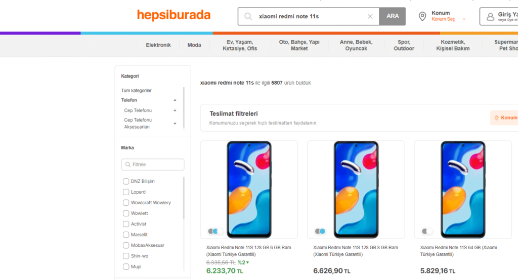 يبلغ سعر هاتف شاومي نوت 11 إس Xiaomi Redmi Note 11s في متجر هبسي بوردا 5.829 ليرة تركية وذلك بحسب السعة التخزينة واللون.