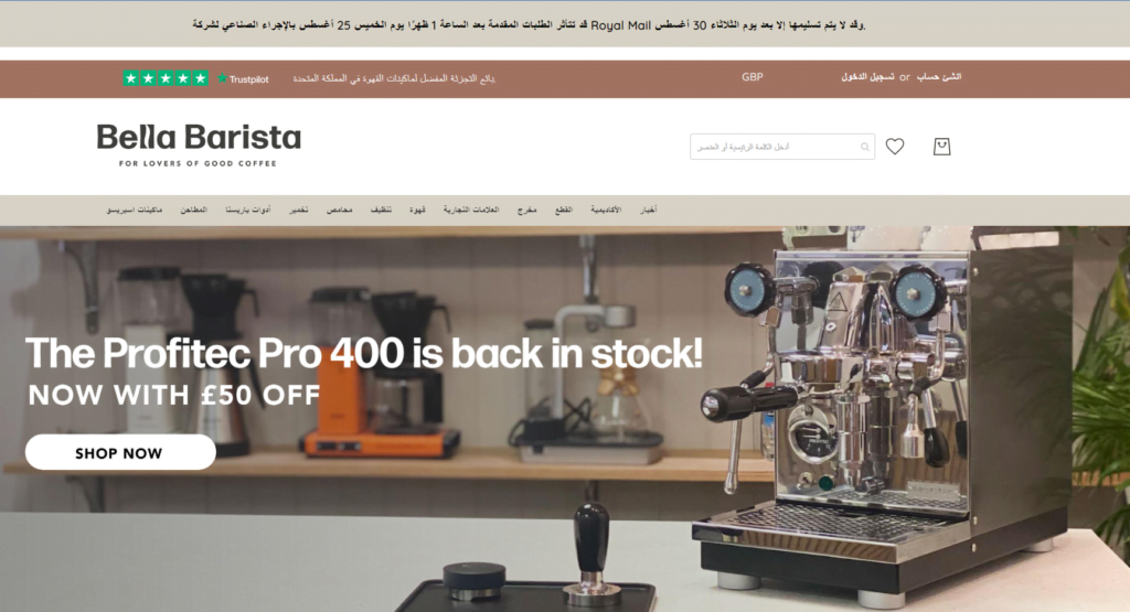 موقع بيلا باريستا bella barista من أـفضل مواقع شراء ماكينات القهوة حيث يوفر الموقع معدات قهوة عالية الجودة بسعر مخفض ومنها ماكينات القهوة وطواحين الاسبرسو المنزلية والمكتبية لأفضل الماركات العالمية كما يضم الموقع ماكينات تحميص القهوة وأنواع كثيرة من القهوة الخضراء كما يتيح الموقع الشحن السريع وخاصة إلى السعودةية وكافة أنحاء العالم.