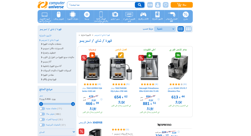 موقع computeruniverse هو موقع ألماني متخصص ببيع الأجهزة الالكترونية والأجهزة المنزلية ويوجد ضمن الموقع قسم خاص بماكينات القهوة والاسبرسو وبمختلف الماركات العالمية والكثير من المواصفات والمميزات وبأسعار منافسة مع الشحن الفوري وإمكانية الدفع عن طريق حساب باي بال.
