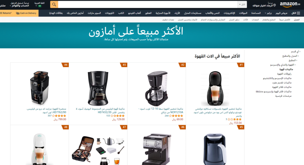 موقع أمازون غني عن التعريف فهو اشهر المواقع العالمية للشراء عبر الانترنت حيث يحتوي الموقع عل قسم خاص بماكينات صنع القهوة وماكينات الاسبرسو والكابتشينو وماكينات فلاتر القهوة وبأسعار منافسة بالإضافة إلى الشحن السريع إلى أي مكان تحددونه بكل سهولة وموثوقية.