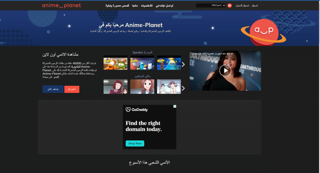 موقع Anime-Planet انمي بلانت من أفضل مواقع مشاهدة انمي أون لاين ومتابعة أحدث حلقات مسلسلات الانمي العالمية وأكثرها شهرة كما يتيح الموقع العديد من التوصيات الرائعة لمتابعة أفلام ومسلسلات انمي بجودة عالية ومن أهم مميزات الموقع أنه لا يحتوي على إعلانات بالإضافة إلى إمكانية الانضمام إلى مجتمع أنمي بلانت والتعرف على المستخدمين الآخرين الذين لديهم نفس اهتماماتك.