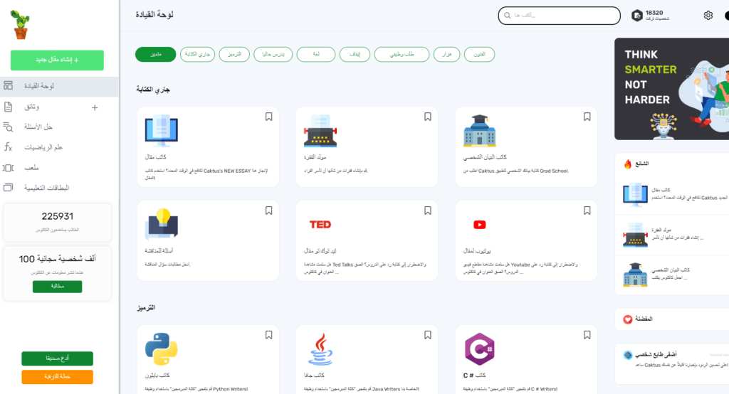 يقدم لكم موقع كاكتوس أي العديد من مجالات التعلم بالذكاء الاصطناعي ومنها كتابة المقالات وكتابة السيرة الذاتية وكل ما يخص المبرمجين والكتابة بلغة البايثون كما يتيح لكم الإجابة عن الأسئلة التي تخطر ببالكم ويوفر لكم مقالات ودروس اليوتيوب بكل سهولة.
