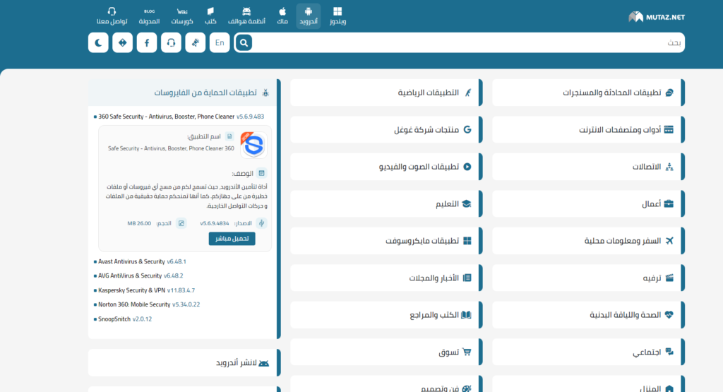 يعتبر موقع معتز Mutaz من أفضل المواقع المجانية التي توفر تنزيل التطبيقات مجانا للهواتف الذكية الاندرويد والماك وبكل سهولة وتجدون في الموقع برامج وتطبيقات الحماية من الفيروسات والتطبيقات الرياضية ولانشر أندرويد وتطبيقات المحادثة وتطبيقات الصحة واللياقة البدنية والترفيه والأعمال وغيرها الكثير.