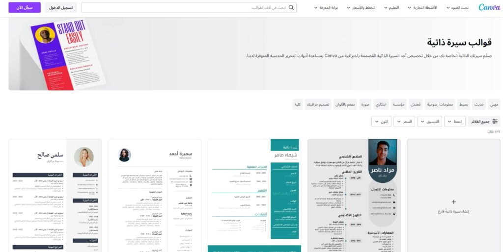 عندما تقوم بزيارة موقع Canva CV، يمكنك الاختيار من بين مجموعة متنوعة من القوالب المخصصة للسيرة الذاتية، ويمكنك اختيار القالب الذي يناسبك ومن ثم تعديله وتخصيصه وفقًا لاحتياجاتك الشخصية.