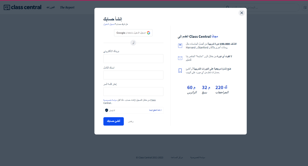 للتسجيل في Class Central، يمكنك اتباع الخطوات التالية: