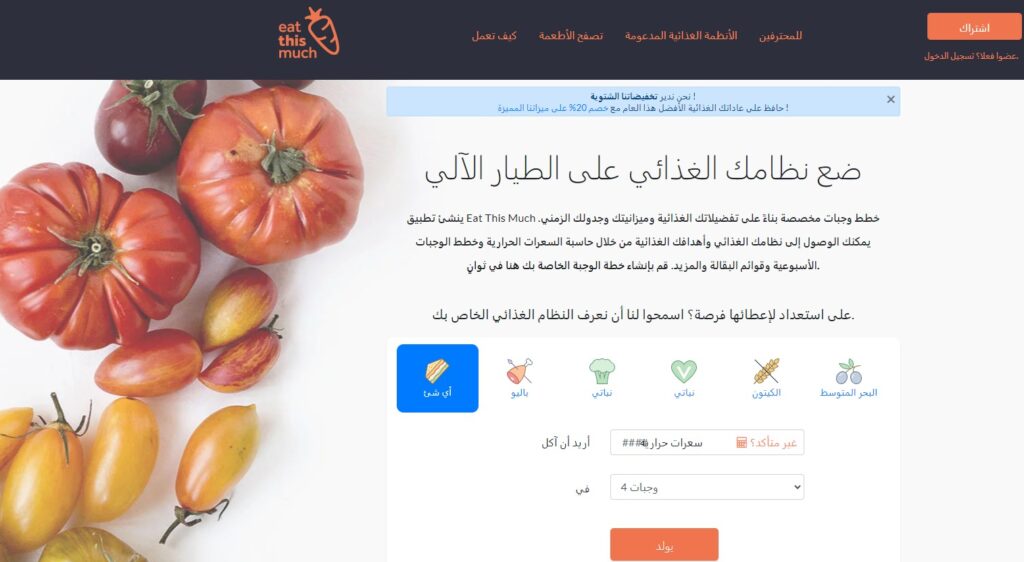 يساعدك موقع Eat This Much في إنشاء خطط وجبات مخصصة بناءً على تفضيلاتك الغذائية وميزانيتك وجدولك الزمني، يمكنك الوصول إلى نظامك الغذائي وأهدافك الغذائية من خلال حاسبة السعرات الحرارية وخطط الوجبات الأسبوعية وقوائم البقالة والمزيد. قم بإنشاء خطة الوجبة الخاصة بك هنا في ثواني.