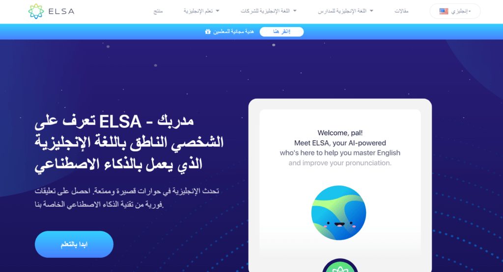 موقع elsa speak هو مساعدكم الشخصي في تعلم اللغة الإنكليزية وتصحيح أخطاء النطق بواسطة الذكاء الاصطناعي الذي يقوم بالتعرف على الصوت والكشف عن الخطأ في نطق الكلمات والجمل الإنكليزية بكل سهولة وبطريقة ممتعة تزيد من شغفكم في تعلم اللغة الإنكليزية و إتقان النطق والمحادثة بشكل سليم.