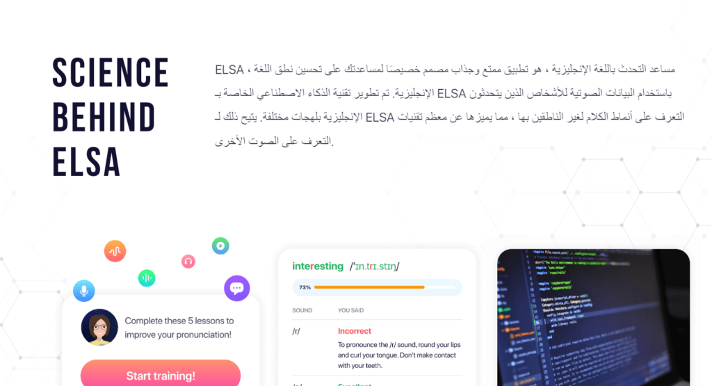موقع إلسا يقوم بتدريبكم على كيفية تحدث الإنجليزية مثل الأمريكي بكل سهولة كما يوجد مدرب افتراضي يستطيع من خلاله المستخدم التحدث معه وأن يقوم بوضع النقاط على الحروف ليبين مدى صحة النطق من عدمه ويقوم ايضاً بتحليل النطق و مقارنته بالنطق السليم.
