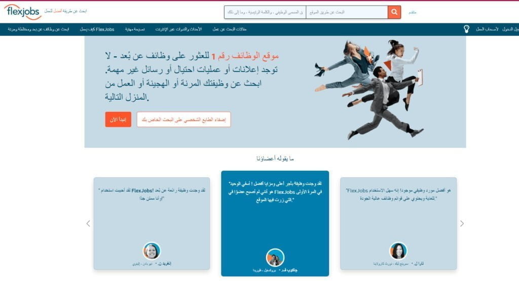 يعتبر Flex jobs أفضل موقع للحصول على وظائف عن بُعد والعمل من المنزل والوظائف المرنة، ويساعدكم الموقع في البحث عن وظائف بشكل أسرع وأسهل وأكثر أمان، ويعمل فريق من الخبراء في المقع بلا كلل للعثور على أفضل الوظائف المرنة عن بُعد وفحصها، وتوفير معلومات عن كل شركة لمساعدتك في تحديد ما إذا كنت ترغب في التقديم.