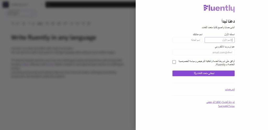 - وافق على شروط الخدمة واتفاقية الترخيص وسياسة الخصوصية في Fluently.