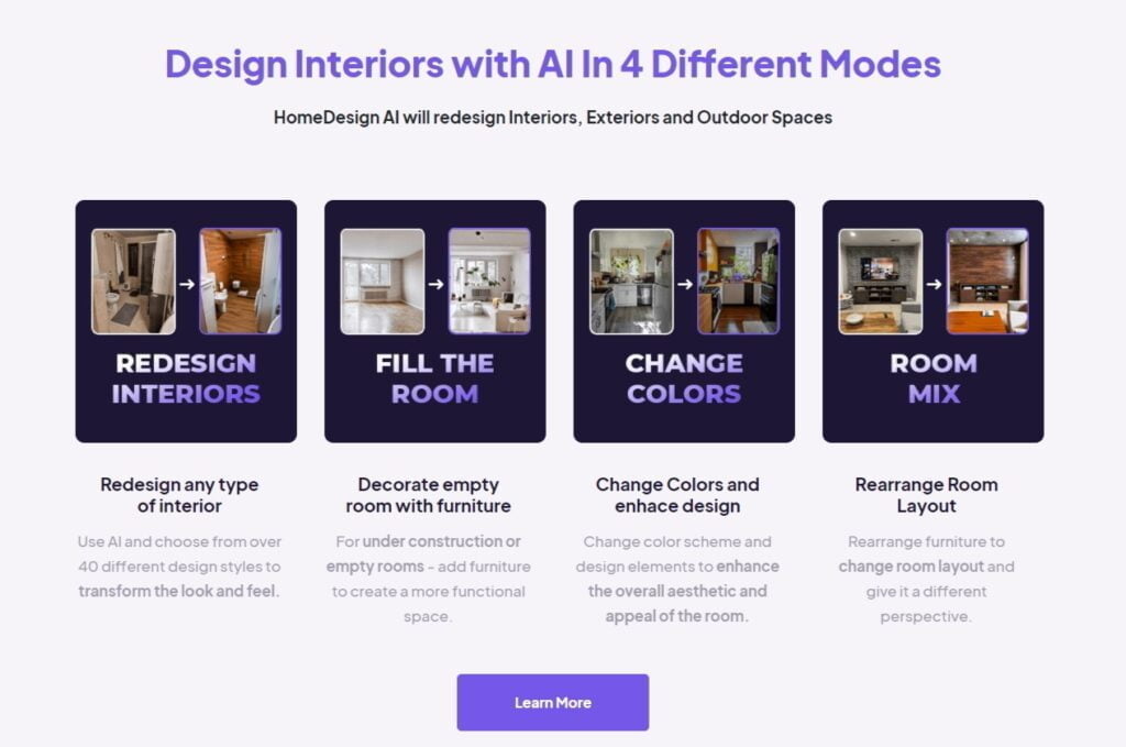 ومن خلال Home Designs AI يمكنكم إنشاء تصميم داخلي مع الذكاء الاصطناعي في 4 أوضاع مختلفة وهي: