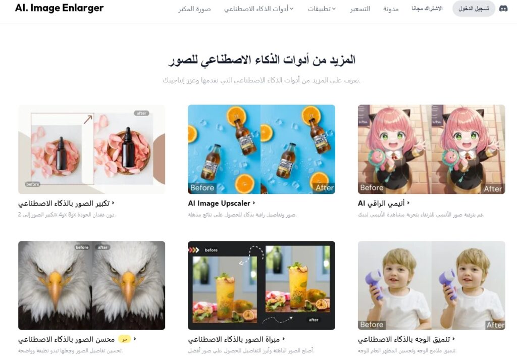 يقدم موقع AI Image Enlarger العديد من أدوات الذكاء الاصطناعي للصور ومنها نذكر لكم: