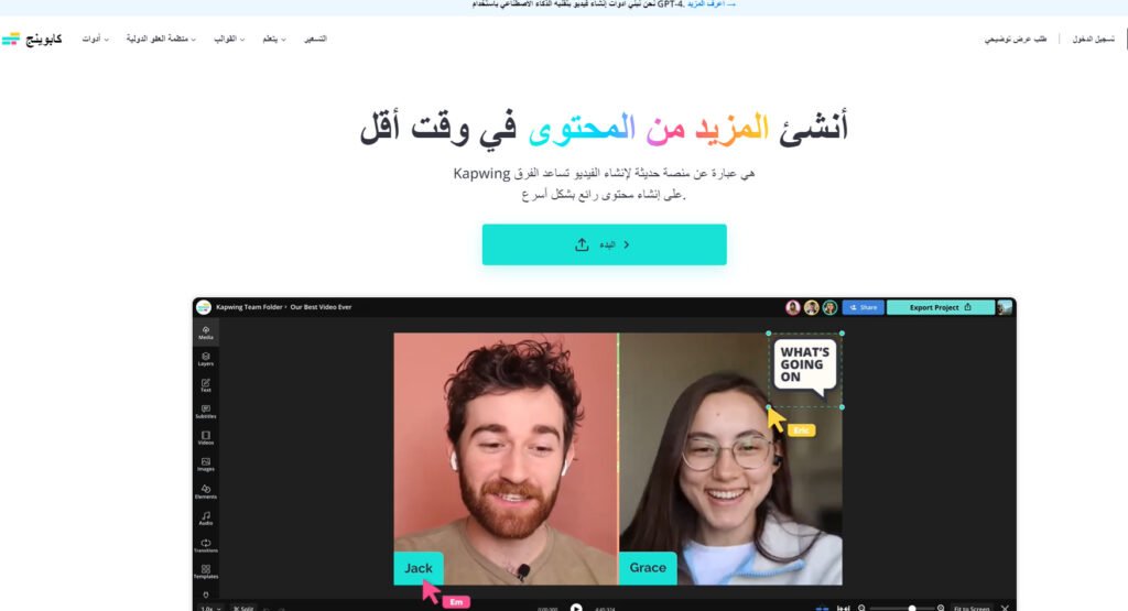 من خلال موقع Kapwing يمكنك إنشاء فيديو بالذكاء الاصطناعي قم بتحرير مقطع الفيديو الخاص بك وقصه وتحسينه باستخدام الأدوات المتطورة والمدعومة بالذكاء الاصطناعي، ويمكنك إنشاء مقاطع فيديو بمجرد الكتابة أو أزل الصمت وضوضاء الخلفية تلقائيًا بنقرة واحدة.