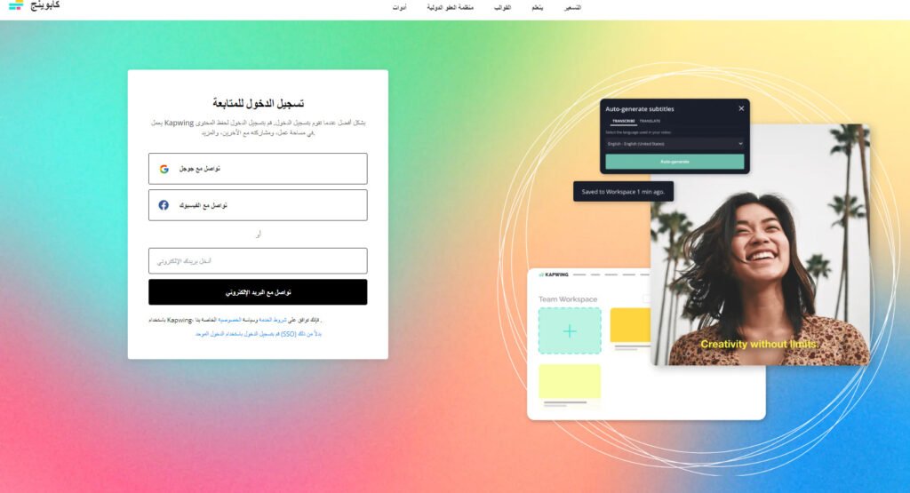 تسجيل الدخول إلى Kapwing سهل ومجاني، فيما يلي خطوات إعداد حسابك: