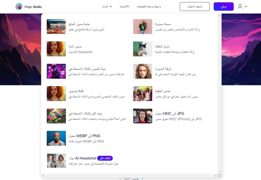 يقدم موقع ماجيك ستوديو أفضل موقع بالذكاء الاصطناعي لتحرير الصور، العديد من الأدوات المتقدمة والمدعومة بالذكاء الاصطناعي لتحرير الصور، وتشمل هذه الأدوات ما يلي:
